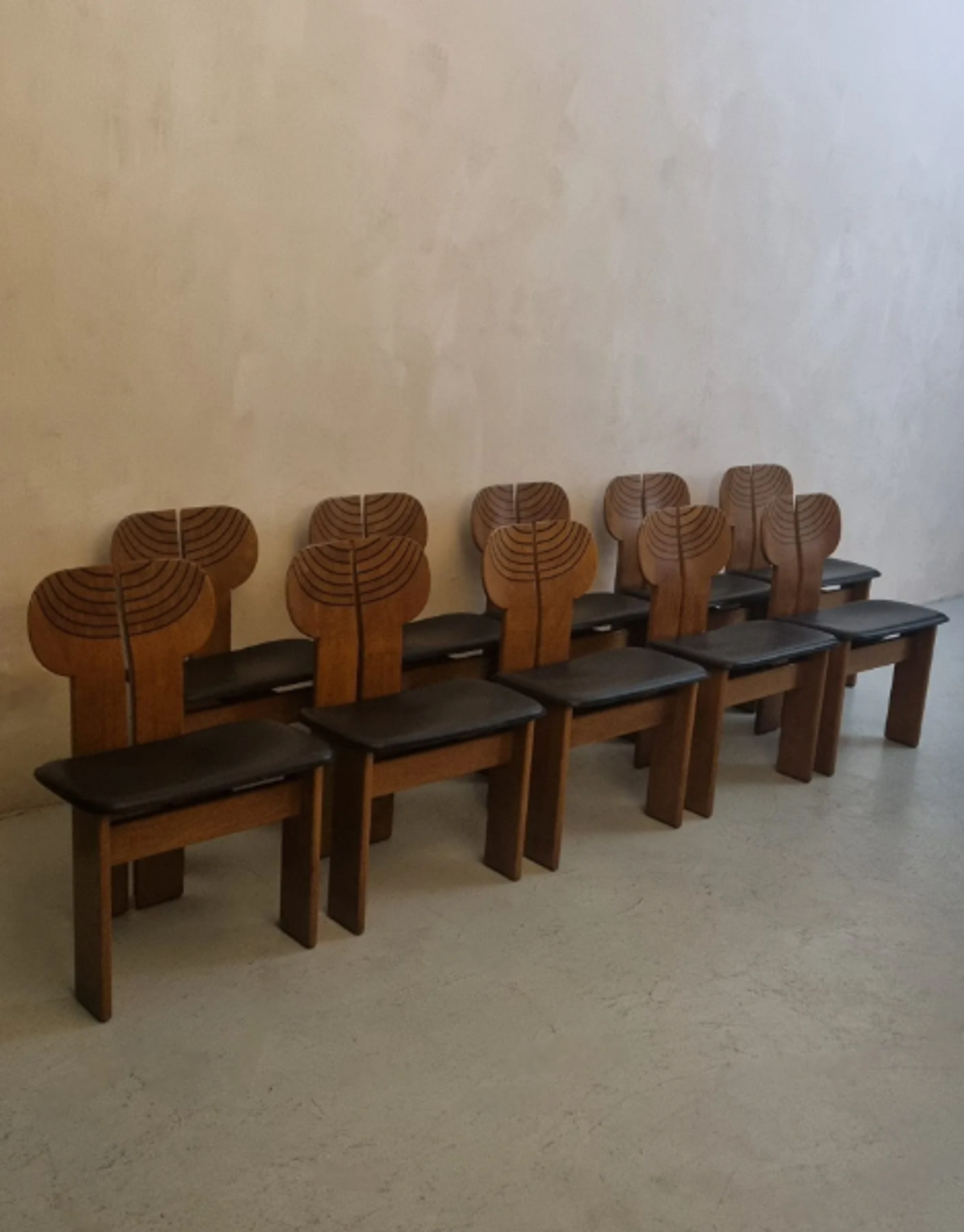 Artona Africa chair designed by Afra and Tobia Scarpa for Maxalto 1970s. Crafted in walnut timber and upholstered in leather. The chairs are in excellent condition and have been fully restored by an atelier in Italy. There are 10 chairs available.