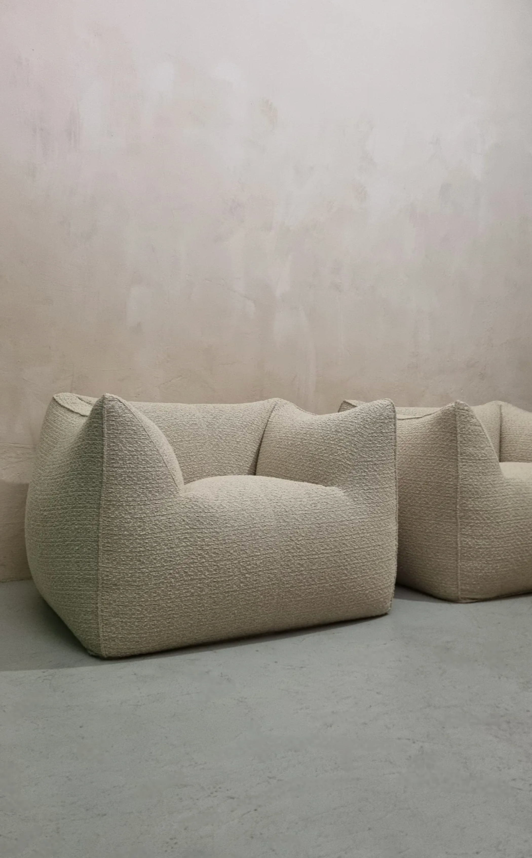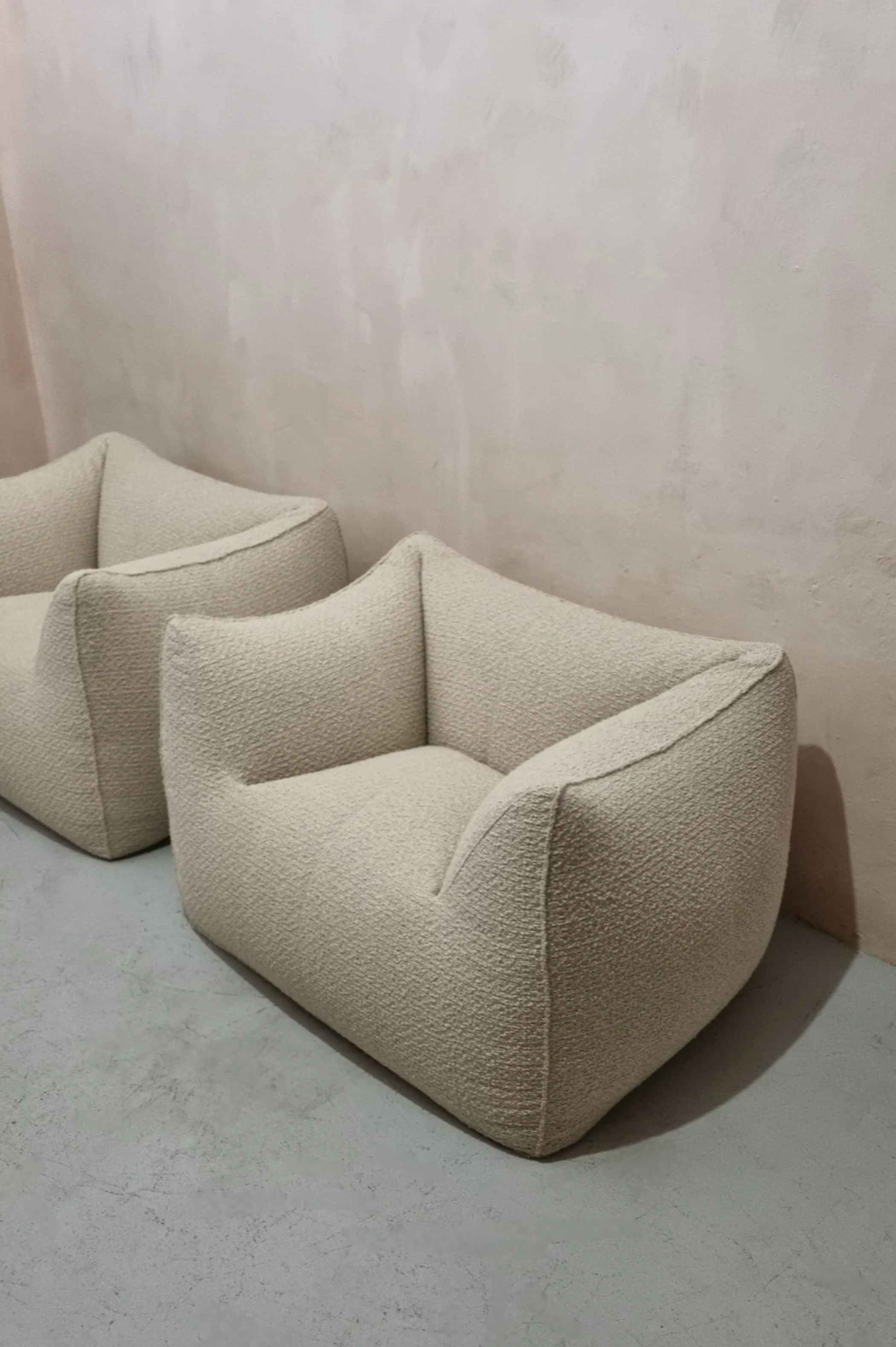 The Le Bambole collection, designed by Mario Bellini for B&B Italia in 1972, is a renowned icon of 1970s Italian design, celebrated for its unique, soft, and structureless appearance. These original vintage armchairs have been reupholstered in a soft boucle fabric. Two armchairs available for purchase.