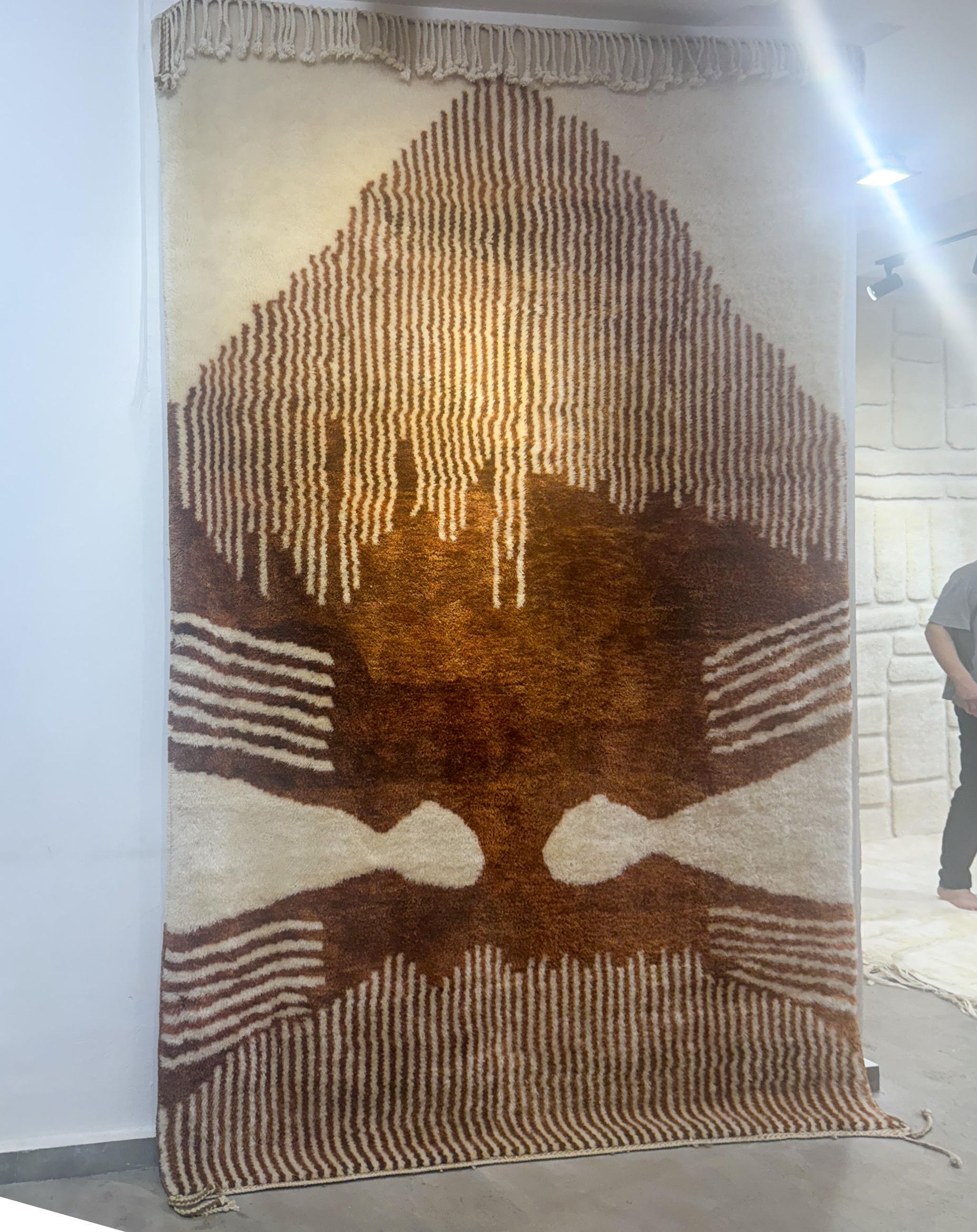Moroccan Beni wool rug handwoven in Morocco using traditional methods. The rug has been sourced in Morocco from one of the finest manufacturers. The rug feels soft and luxurious underfoot with a Moroccan pattern design and a brown and cream colour palette to suit a warm and inviting interior space.