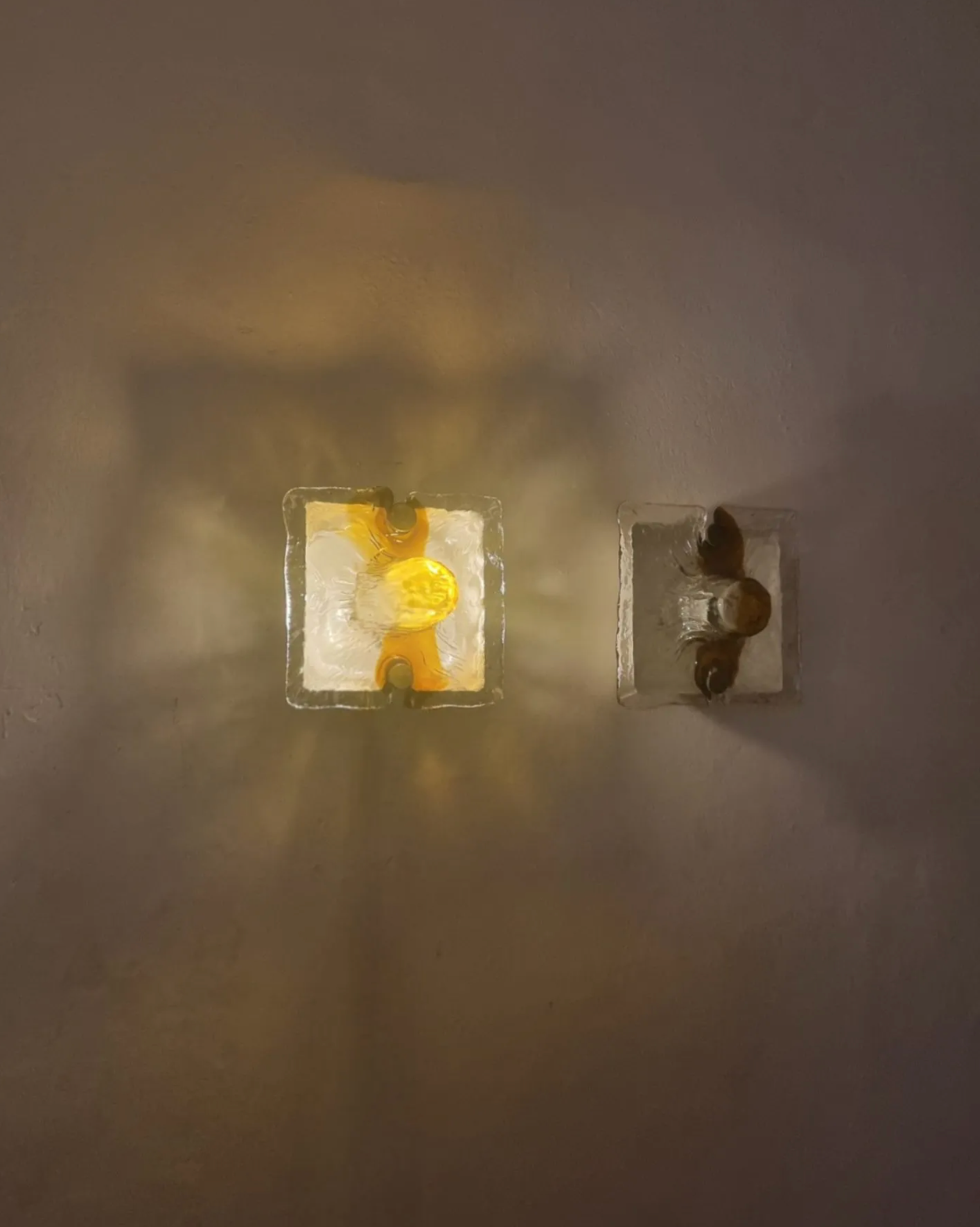 Set of two wall sconces designed by Toni Zuccheri for Venini 1970. Painted Metal structure, brass and Murano glass diffusers.